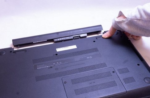 - Step 1: On the bottom of the laptop, locate the battery release latch marked with a battery icon. Push the detaching hook into the release point to partly eject the battery.